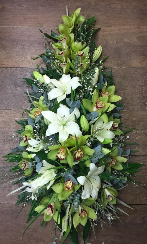 Stunning green Cymbidium orchids and White Lillies create a visually stunning spray.
