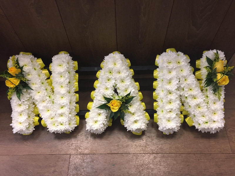 Nan Tribute, ribbon edge, white base chrysanthemums and colour coordinating sprays on each letter.