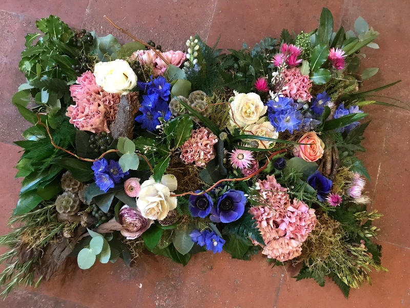 Textured Pillow created using Moss, Twisted Willow, dried scabious and an array of fresh flowers. The tribute has a slight woodland feel to the finish and looks visually stunning.