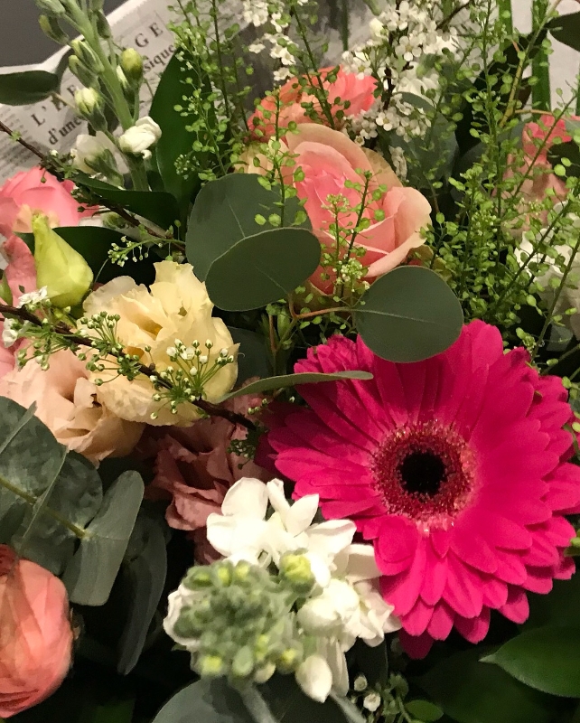 Whimsical and soft, Pale pink, soft Greens and a hint of cerise tied loosely to create a relaxed looking bouquet.
