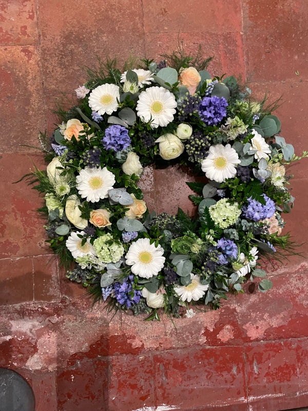 Beautiful and stylish white and pale blue wreath,  teaming with seasonal blooms helps create this fresh spring like look.