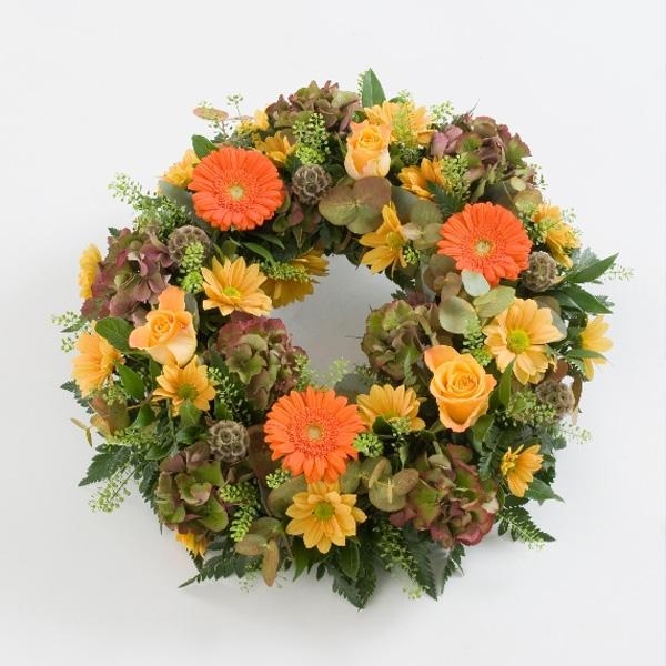 Roses, gerbera and scabious are a few of the flowers that create this lovely wreath